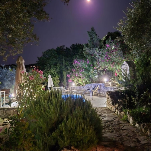 L’endroit est très calme sans voisin direct. La décoration »ambiance « marine » est soignée .Grande terrasse ombragée vue sur mer avec piscine privée de 7 x 4 mètres(reconstruite en 2018) et un grand terrain garni d’oliviers, de palmiers et plantes diverses. Le parking est privé.